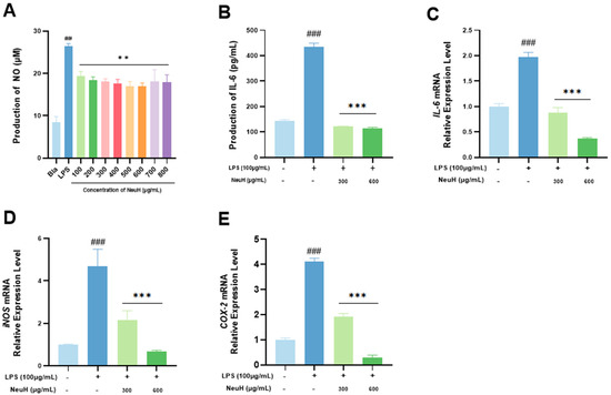 Nitric oxide (NO) secretion was significantly higher in the LPS group than in the blank control group (p < 0.01), indicating that the inflammatory model was successfully established (Figure 5A). NeuH significantly reduced NO secretion of RAW 264.7 cells (p < 0.01), and a concentration-dependent trend was observed within the concentration range of 100–600 μg/mL. The effect of NeuH on the secretion of IL-6 cytokine by RAW 264.7 cells is depicted in Figure 5B. NeuH significantly reduced LPS-induced secretion of the inflammatory cytokine IL-6 (p < 0.01) in a concentration-dependent manner. LPS stimulation for 24 h significantly upregulated gene transcription of IL-6 (Figure 5C), iNOS (Figure 5D) and COX-2 (Figure 5E). Treatment with NeuH significantly downregulated the transcription of IL-6, iNOS, and COX-2 genes (p < 0.001) (Figure 5C–E).