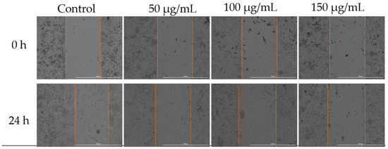 ® Instruments Inc., Winooski, VT, USA) in accordance with the manufacturer’s guidelines. Immediately after wounding (T0), images were taken to document the initial scratch area using the Cytation 1 imaging system. Cells were then exposed to three concentrations of the extract (50, 100, and 150 μg/mL) for a period of 24 h. These concentrations were selected based on prior viability results, which showed a graded response and allowed for the assessment of migration without excessive cytotoxic interference. After 24 h (T24), images were captured again, and the extent of wound closure was analyzed using the Gen5™ software. The migration rate was calculated according to a previously established method [