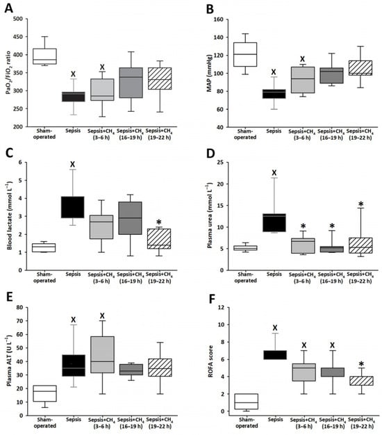 PaO2/FiO2 ratio (A), mean arterial pressure (MAP) (B), blood lactate (C), plasma urea (D), plasma alanine aminotransferase (ALT) (E), and Rat-specific Organ Failure Assessment (ROFA) scores (F) in the sham-operated group and in various groups of septic animals (untreated or treated with CH4 at t = 3–6 h, 16–19 h, or 19–22 h). Median with 25th and 75th percentiles; X p < 0.05 versus sham-operated group; * p < 0.05 versus untreated septic group.