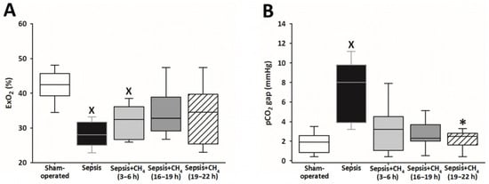 Oxygen extraction (ExO2) (A) and partial carbon dioxide gap (pCO2 gap) (B) in the sham-operated group and in various groups of septic animals (untreated or treated with CH4 at t = 3–6 h, 16–19 h, or 19–22 h). Median with 25th and 75th percentiles; X p < 0.05 versus sham-operated group; * p < 0.05 versus untreated septic group.