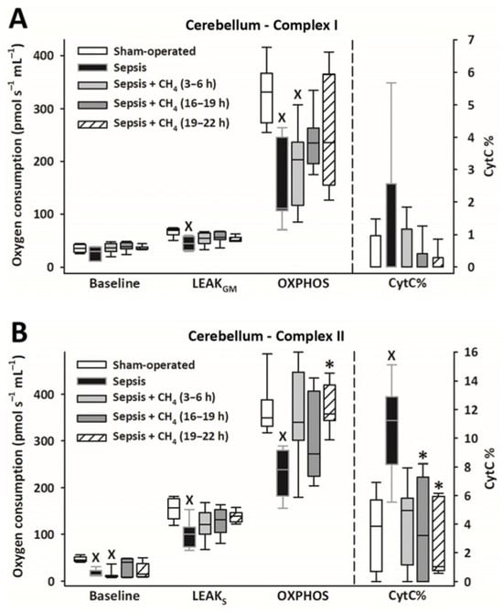 Mitochondrial respiration linked to Complex I (A) and II (B) in the cerebellum in the sham-operated group and in various groups of septic animals (untreated or treated with CH4 at t = 3–6 h, 16–19 h, or 19–22 h). Median with 25th and 75th percentiles; X p < 0.05 versus sham-operated group; * p < 0.05 versus untreated septic group. Respiratory states: Baseline: respiration without external substrates and inhibitors; LEAKGM: glutamate-malate-supported respiration; LEAKS: succinate-supported respiration capacity; OXPHOS: ADP-stimulated respiration capacity; CytC%: increase in oxygen consumption after addition of CytC, expressed as a percentage of OXPHOS respiration.