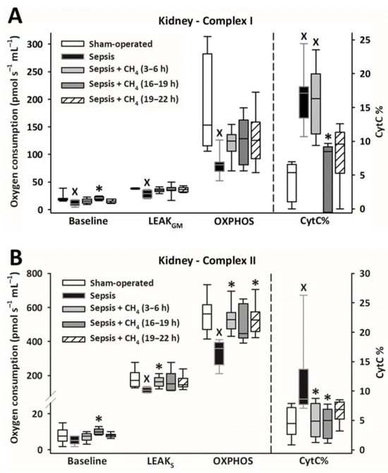 Mitochondrial respiration linked to Complex I (A) and II (B) in the kidney in the sham-operated group and in various groups of septic animals (untreated or treated with CH4 at t = 3–6 h, 16–19 h, or 19–22 h). Median with 25th and 75th percentiles; X p < 0.05 versus sham-operated group; * p < 0.05 versus untreated septic group. Respiratory states: Baseline: respiration without external substrates and inhibitors; LEAKGM: glutamate-malate-supported respiration; LEAKS: succinate-supported respiration capacity; OXPHOS: ADP-stimulated respiration capacity; CytC%: increase in oxygen consumption after addition of CytC, expressed as a percentage of OXPHOS respiration.