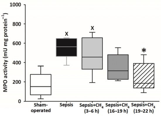 Plasma myeloperoxidase (MPO) activity in the sham-operated group and in various groups of septic animals (untreated or treated with CH4 at t = 3–6 h, 16–19 h, or 19–22 h). Median with 25th and 75th percentiles; X p < 0.05 versus sham-operated group; * p < 0.05 versus untreated septic group.