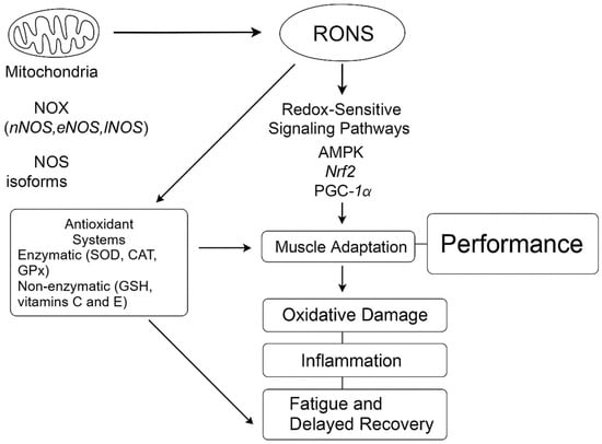 In addition to mitochondrial sources, nonmitochondrial enzymes such as NADPH oxidase (NOX), xanthine oxidase, and nitric oxide synthase isoforms including nNOS and eNOS are activated in response to mechanical loading, inflammation, and transient hypoxia, all of which are frequently encountered during competitive play []. Eccentric muscle contractions, including those involved in braking, cutting, and deceleration, further increase RONS production by causing localized muscle damage and triggering inflammatory responses [].