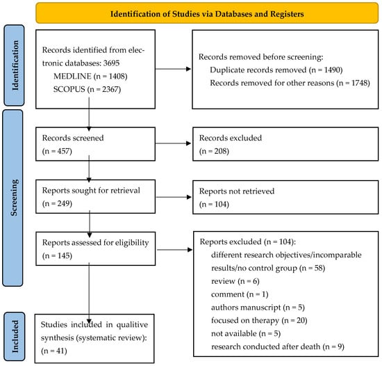 Initially, a total of 3695 documents were identified in this literature search, of which 1408 were from MEDLINE and 2367 from Scopus. After eliminating 1490 duplicate articles and 1748 articles for other reasons (incomparable results, poorly presented results, samples without a control group, incomplete articles with missing sections, and articles with titles and introductions in English while the rest of the text was written in another language), 457 articles were screened. Additionally, five records were categorised as not available (not available for download or not published). The inclusion and exclusion criteria were then reviewed and finally 41 articles were included in this study. The study process and the PRISMA 2020 flowchart are shown in Figure 1.