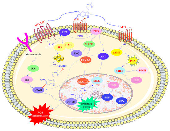 | MEL activates PKA, which in turn stimulates the transcription factor CREB. Activation of CREB leads to the upregulation of BDNF and Nrf2, further increasing the activity of SOD and GPx. | [14,41,46,47] | ||