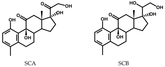 We recently reported the synthesis of biosteroids from the bioconversion of cortisone using a biocatalytic process driven by Rhodococcus rhodnii DSM 43960, this bacterium is able to catabolize steroid molecules by selective uptaking in microbial cells and following the 9,10-seco pathway [9], resulting in the following products: 1,9β,17,21-tetrahydroxy-4-methyl-19-nor-9β-pregna-1,3,5(10)-trien-11,20-dione (SCA) and 1,9β,17,20β,21-pentahydroxy-4-methyl-19-nor-9β-pregna-1,3,5(10)-trien-11-one (SCB) recovered in the bioconversion medium (Figure 1).