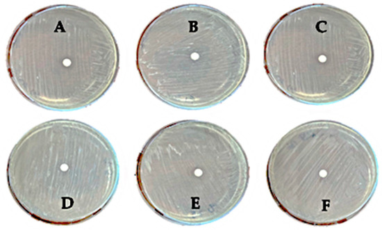 Disk diffusion test for UOLM at concentrations of 5% (A), 10% (B), 20% (C), 50% (D), 75% (E), and 100% (F) v/v against Rhodococcus rhodnii DSM 43960.