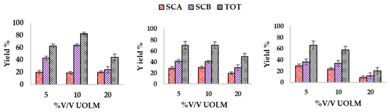 As demonstrated in Figure 4, increasing cortisone concentration in the administered from 1.00 g/L to 1.50 g/L results in a progressive decrease in the total bioconversion yield. Furthermore, SCA production remains relatively stable without significant variations at a constant cortisone concentration, except when the biocatalytic process is conducted at 1.50 g/L cortisone, where an increase in UOLM concentration from 5% v/v to 20% v/v results in a progressive decrease in SCA synthesis.