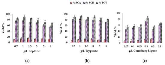 When tryptone was used as a supplement, the SCA production trend was like the one observed with peptone. In this case, increasing the concentration of tryptone from 0.7 g/L to 3.0 g/L led to an increase in the SCA yield, reaching a maximum of 11 ± 3.0%. However, further increases in the tryptone concentration beyond 3.0 g/L caused the yield to decrease. The synthesis of SCB peaked at a tryptone concentration of 1.0 g/L, with a yield% of 82% ± 4.8. Based on these observations, the total process yield reached its highest value at a tryptone concentration of 1.0 g/L, corresponding to a yield% of 92% ± 3.1. Again, the addition of a supplement such as tryptone does not seem justified when compared to the yields obtained using UOLM alone at 10% v/v and pH 7.5. Both tryptone and peptone are supplements that introduce additional costs to the process [37,38], which, in this case, do not justify the production of SCA and SCB in relevant quantities compared to using UOLM at 10% v/v and pH 7.5 alone. This reinforces the notion that UOLM, derived entirely from agricultural waste, serves not only as a cost-effective alternative to synthetic media, but also minimizes the use of chemically defined nutrients. Its successful application validates olive leaf waste as a practical medium component with competitive performance, contributing to more economical and environmentally sustainable bioprocesses.
