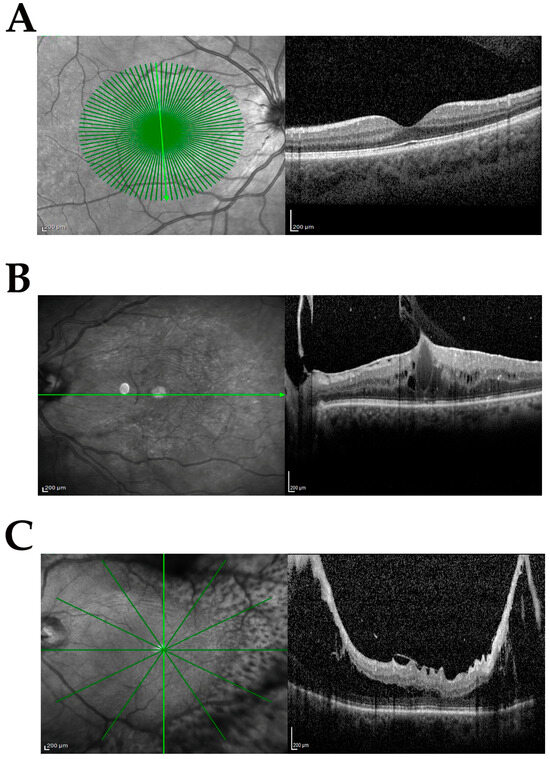 The study population included samples from phaco-vitrectomy comprising control (cataract) and case samples. Three subgroups were produced from the case population according to the following inclusion and exclusion criteria: no-dERM, dERM, and PDR. All subgroups used for this comparative study are shown in Table 1. The complete ophthalmic examination was performed before surgery and disease severity was defined according to standard protocols and used for categorizing biosamples. Figure 1A–C shows the representative SD-OCT images from cataract (Figure 1A), dERM (Figure 1B), and PDR (Figure 1C).