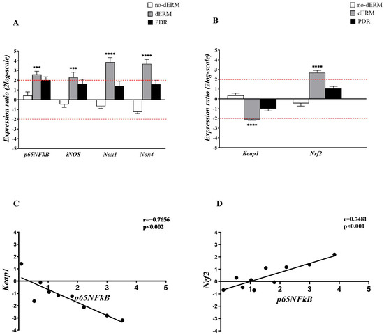 Inflammatory and oxidative stress regulators in aqueous cells. (A,B) Relative expression ratio (fold-changes) in no-dERM, dERM, and PDR patients with respect to controls. (A) Bar-graph showing a significant upregulation for p65NFkB, iNOS, Nox1 and Nox4 transcripts in dERM patients with respect to PDR, no-dERM, and controls. (B) A significant deregulation of Keap1 and upregulation of Nrf2 were observed in dERM with respect to PDR, no-dERM, and controls. Statistical assessment performed with the Rest-ANOVA Dunnett’s coupled analysis as reported: *** p < 0.001, **** p < 0.0001; data are shown as mean ± SD in a log2-scale and the limit 2 was used as referring threshold (red dashed line; (A,B)). (C,D) Plots showing the correlation between the inflammatory transcription factor p65NFĸB and the epigenetic Keap1 (C) and Nrf2 (D) genes. The correlation values from the Pearson’s rho test analysis are shown in the panels.