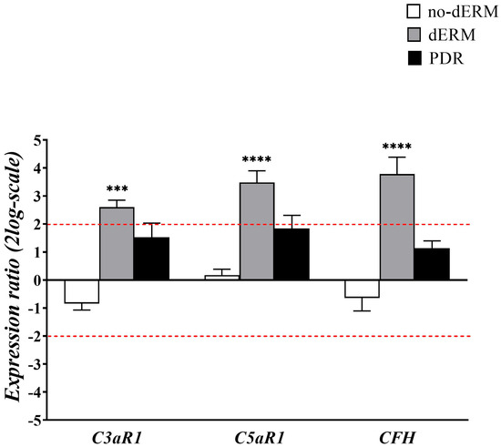 As for oxidative stress regulators, transcripts’ expression of C3a/C5a receptors1 and complement factor H were investigated in total RNAs from aqueous cells of no-dERM, dERM, PDR, and control patients (Figure 3).