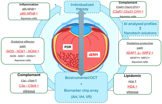 Schematic representation of the data obtained from this biomolecular analysis carried out on aqueous cells and clear vitreous from dERM (red) and PDR (black), both collected at the time of phaco-vitrectomy. As highlighted, the Keap1-Nrf2 signal pathway might suggest an opportunity to escape from disease progression, as observed in dERM rather than PDR. This path is one of the major regulators for cell protection against oxidative stress and complement dysregulation (ROS, RNS, complement fragments). Any possibility to stratify patients for an individualized therapy could be achievable by the crosstalk between biostrumental (including high-resolution imaging techniques) and biomolecular candidates. In this context, the artificial intelligence-driven biomarker selection for the preparation of nanotechnology-based ophthalmic drugs represents a mandatory step for support a tailored therapy. The gray ⬌ indicates the mandatory tools for individualized therapy. Biomarker expressions (inside rectangle dialog boxes) were reported in red for dERM and black for PDR, with arrows indicating upregulation/increase (↑) or downregulation/decrease (↓). The arrow-circle and the blue dotted squares indicate all the main aspects in the process for individualized therapy. Legend: AI, artificial intelligence; dERM, diabetic epiretinal membrane; PDR, proliferative diabetic retinopathy; OCT, optical coherence tomography; ROS, reactive oxigen species; RNS, reactive nitrogen species; AH, aqueous humor; VH, vitreous humor, VR, vitreal reflux.