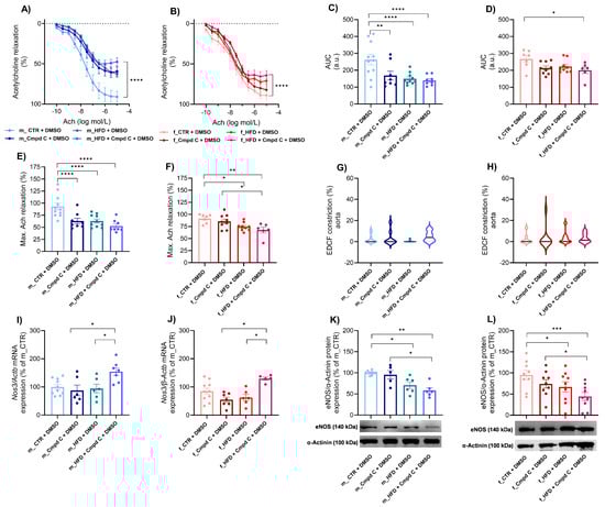 Induction of ED in the aorta in male and female rats—role of AMPK. The development of ED was analysed in intact rat aortic rings using an organ bath system and expressed as an Ach response curve in (A) young male WKYs (n= 8–11) and (B) young female WKYs (n = 6–9); an AUC of Ach curve in (C) young male WKYs (n = 8–11) and (D) young female WKYs (n = 6–9); and maximal Ach relaxation in (E) young male WKYs (n = 8–11) and (F) young female WKYs (n = 6–9). From the Ach relaxation curves, the EDCF constriction was calculated in (G) young male WKYs (n = 8–11) and (H) young female WKYs (n = 6–9). The expression of eNOS was determined by qRT-PCR in aortic tissue in (I) young male WKYs (n = 6–10) and (J) young female WKYs (n = 5–10) or by Western blot in (K) young male WKYs (n = 5–9) and (L) young female WKYs (n = 9). Data are presented as mean ± SEM. p-values < 0.05; were considered significant; * p ≤ 0.05, ** p ≤ 0.01, *** p ≤ 0.001, **** p ≤ 0.0001. Actb—β-actinin; Cmpd C—Compound C; CTR—control rats; EDCF—endothelium-derived contracting factors; eNOS—endothelial nitric oxide synthase (protein); HFD—high-fat diet; Nos3—endothelial nitric oxide synthase (gene).
