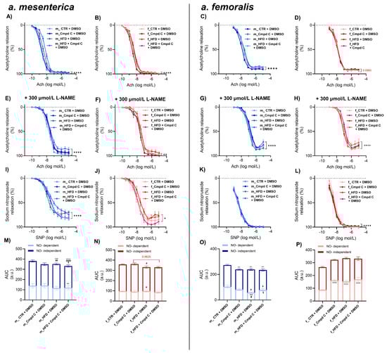 In the femoral artery, vascular reactivity was significantly impaired in male WKY rats treated with Cmpd C, HFD, or both (Figure 2C,O). HFD alone impaired the NO-independent relaxation component compared to the Cmpd C group, and NO-dependent relaxation was diminished compared to the control. Inhibition of AMPK during HFD altered the balance between NO-dependent (increased) and NO-independent (decreased) relaxation components compared to HFD alone.