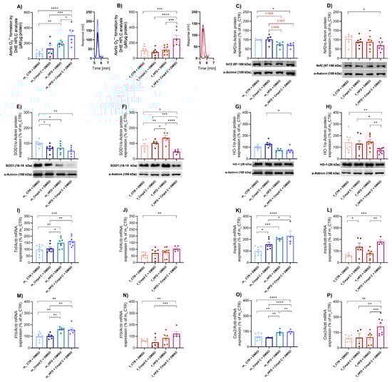 Induction of vascular oxidative stress and inflammation in male and female rats—role of AMPK. Vascular oxidative stress development was evaluated by analysing oxidative stress mar-kers. Superoxide production in rat aortic rings was measured using DHE-HPLC analysis for (A) young male WKYs (n = 5–9) and (B) young female WKYs (n = 6–9), with data shown through chromatograms. The protein expression was analysed by Western blot as follows. Aortic Nrf2 protein expression in (C) young male WKYs (n = 7–9) and (D) young female WKYs (n = 6); aortic SOD1 protein expression in (E) young male WKYs (n= 5–9) and (F) young female WKYs (n = 5–6) and aortic HO-1 protein expression in (G) young male WKYs (n = 5–9) and (H) young female WKYs (n = 7–8). The expression analysis of inflammatory markers assessed the development of vascular inflammation in the rat aortic tissue. The expression of Tnf mRNA was determined by qRT-PCR in aortic tissue in (I) young male WKYs (n = 8–9) and (J) young female WKYs (n = 5–10); aortic Inos mRNA in (K) young male WKYs (n = 4–8) and (L) young female WKYs (n = 4–6); aortic Il1b mRNA in (M) young male WKYs (n = 6–9) and (N) young female WKYs (n = 5–8); and aortic Cox2 mRNA in (O) young male WKYs (n = 4–7) and (P) young female WKYs (n = 4–8). Data are presented as mean ± SEM. p-values < 0.05 were considered significant; * p ≤ 0.05, ** p ≤ 0.01, *** p ≤ 0.001, **** p ≤ 0.0001. Cmpd C—Compound C; Cox2—cyclooxygenase-2; CTR—control rats; DHE—dihydroethidium; HFD—high-fat diet; HO-1—heme oxygenase 1; HPLC—high-performance liquid chromatography; Il1b—interleukin 1-β; Inos—inducible nitric oxide synthase; Nrf2—nuclear factor erythroid 2-related factor 2; SOD1—superoxide dismutase 1; Tnf—tumour necrosis factor-alpha.