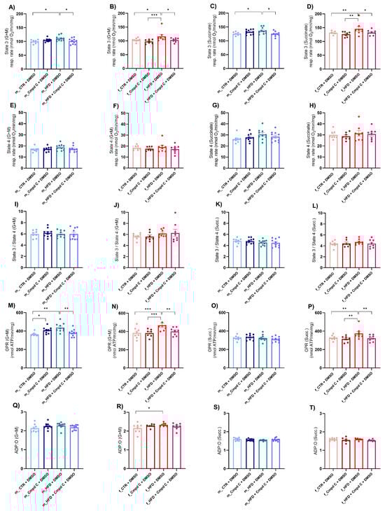 Induction of mitochondrial respiration in male and female rats—role of AMPK. The development of mitochondrial dysfunction was assessed in the mitochondria isolated from the liver. Mitochondrial respiration was analysed as (A) State 3 (G + M) in young male WKYs (n = 8–10); (B) State 3 (G + M) in young female WKYs (n = 7–8); (C) State 3 (Succ.) in young male WKYs (n = 8–10); (D) State 3 (Succ.) in young female WKYs (n = 7–8); (E) State 4 (G + M) in young male WKYs (n = 8–10); (F) State 4 (G + M) in young female WKYs (n = 7–8); (G) State 4 (Succ.) in young male WKYs (n = 8–10); (H) State 4 (Succ.) in young female WKYs (n = 7–8); (I) State 3/4 (G + M) in young male WKYs (n= 8–10); (J) State 3/4 (G + M) in young female WKYs (n = 7–8); (K) State 3/4 (Succ.) in young male WKYs (n = 8–10); (L) State 3/4 (Succ.) in young female WKYs (n = 7–8); (M) OPR (G + M) in young male WKYs (n = 8–10); (N) OPR (G + M) in young female WKYs (n = 7–8); (O) OPR (Succ.) in young male WKYs (n = 8–10); (P) OPR (Succ.) in young female WKYs (n = 7–8); (Q) ADP:O (G + M) in young male WKYs (n = 8–10); (R) ADP:O (G + M) in young female WKYs (n = 7–8); (S) ADP:O (Succ.) in young male WKYs (n = 8–10) and (T) ADP:O (Succ.) in young female WKYs (n = 7–8). Data are presented as mean ± SEM. p-values < 0.05 were considered significant; * p ≤ 0.05, ** p ≤ 0.01, *** p ≤ 0.001. ADP—Adenosine-5’-diphosphate; Cmpd C—Compound C; CTR—control rats; G—glutamate; HFD—high-fat diet; M—malate; OPR—oxidative phosphorylation rate; O—one atom of oxygen; Succ.—succinate.