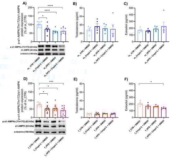 To further investigate the interplay between AMPK signalling and sex hormones, we subsequently analysed plasma sex hormone concentrations. In male rats, plasma estradiol levels remained unchanged (Figure 5C). Conversely, treatment with Cmpd C during HFD feeding in female rats significantly decreased estradiol levels (Figure 5F). Testosterone concentrations were not significantly affected by either HFD, AMPK inhibition, or their combination in any experimental group (Figure 5B,E).