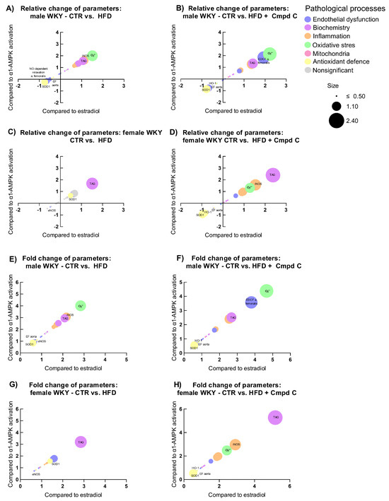 Sex-specific responses of physiological parameters to HFDand AMPK inhibition expressed as relative change induced by (A) HFD in young male WKYs; (B) HFD + Cmpd C in young male WKYs; (C) HFD in young female WKYs; (D) HFD + Cmpd C in young female WKYs; and as fold change induced by (E) HFD in young male WKYs; (F) HFD + Cmpd C in young male WKYs; (G) HFD in young female WKYs, and (H) HFD + Cmpd C in young female WKYs. Only parameters where sex-dependent significant (p-values < 0.05) differences were observed were analysed. α1-AMPK—alpha one adenosine monophosphate-dependent protein kinase; Cmpd C—Compound C; CTR—control rats; EDCF—endothelium-derived contracting factors; EF- endothelial function; eNOS—endothelial nitric oxide synthase; HFD—high-fat diet; HO-1—heme oxygenase 1; iNOS—inducible nitric oxide synthase; NO—nitric oxide; O2•−—superoxide; SOD1—superoxide dismutase 1; TAG—triglycerides.
