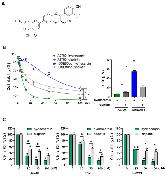 Hydnocarpin isolated from Pueraria Flos (PF) inhibits the growth of human ovarian cancer cells. (A) Chemical structure of hydnocarpin. (B) A2780 ovarian cancer cells and IOSE80pc immortalized ovarian surface epithelial cells were treated with the indicated concentration of hydnocarpin or cisplatin for 48 h. Cell viability was assessed using the MTT assay (left) and the half-maximal inhibitory concentration (IC50) values were calculated (right). (C) HeyA8, ES2, and SKOV3 ovarian cancer cell lines were treated with varying concentrations of hydnocarpin or cisplatin for 48 h, and cell viability was measured by MTT assay. Data are representative of three independent experiments. # p < 0.05 compared with the untreated control group. * p < 0.05 compared with the indicated group.
