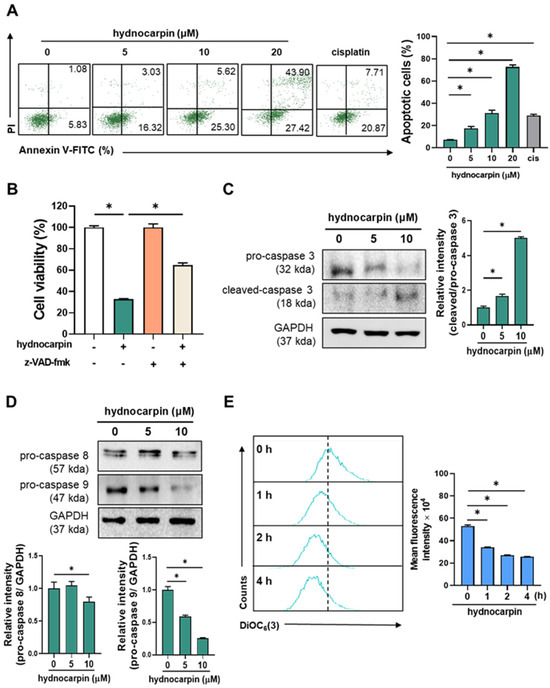 Hydnocarpin induces the caspase-dependent apoptosis of human ovarian cancer cells. (A) A2780 cells were treated with various concentrations of hydnocarpin (5, 10, 20 μM) or 20 μM of cisplatin for 48 h, followed by Annexin V-FITC/PI double staining and flow cytometry analysis to assess apoptotic cell populations. (B) A2780 cells were pretreated with the pan-caspase inhibitor z-VAD-fmk (100 μM) for 2 h prior to 48 h exposure to 10 μM of hydnocarpin. Cell viability was evaluated using the MTT assay. (C,D) Western blot analysis of pro- and cleaved forms of caspase-3 (C) and pro-caspase-8/9 (D) in A2780 cells after 48 h hydnocarpin treatment and densitometric analysis of the Western blot bands. (E) Cells were treated with 10 μM of hydnocarpin for the indicated times, stained with DiOC6(3). Data are representative of three independent experiments. * p < 0.05 compared with the indicated group.
