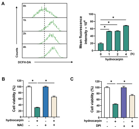 Roles of reactive oxygen species (ROS) and NADPH oxidase in the hydnocarpin-induced apoptosis of ovarian cancer cells. (A) A2780 cells were exposed to 10 μM of hydnocarpin for 0, 2, or 4 h, followed by staining with 1 μM of DCFH-DA for 30 min. The intensity of fluorescence was analyzed by flow cytometry. (B) A2780 cells were pretreated with NAC (7.5 mM) for 30 min prior to treatment with 10 μM of hydnocarpin for 48 h. Cell viability was assessed by MTT assay. (C) Cells were pretreated with DPI (0.1 μM), a NOX inhibitor, for 30 min, before exposure to 10 μM of hydnocarpin for 48 h. Cell viability was assessed by MTT assay. Data are representative of three independent experiments. * p < 0.05 compared with the indicated group.