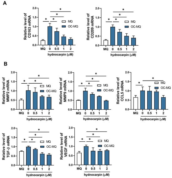 Tumor-associated MQs (TAMs), the TME components around tumors, interact with cancer cells [30]. These MQs are polarized toward the pro-tumor M2 phenotype by cancer cell-derived factors, resulting in the loss of their phagocytic activity and the promotion of tumor progression [31]. To investigate the effects of hydnocarpin on TAMs, we established OC-MQs by treating MQs with the conditioned medium (CM) of A2780 cells. As shown in Figure 4A, hydnocarpin significantly reduced the expression levels of the M2 MQ markers, CD163 and CD209, suggesting that hydnocarpin reprograms the OC-MQs. Furthermore, hydnocarpin markedly decreased the expression levels of cancer-promoting factors, including matrix metalloproteinase (MMP)-2/9, C–C motif chemokine ligand 5, transforming growth factor-β, and vascular endothelial growth factor, which were upregulated in OC-MQs (Figure 4B). These findings suggest that hydnocarpin counteracts the tumor-promoting phenotype of OC-MQs.