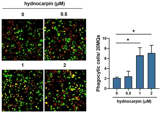 Effect of hydnocarpin on the phagocytic activity of ovarian cancer-stimulated macrophages. CellTracker-Red-labeled MQs were co-cultured with CellTracker-Green-labeled A2780 cells in the presence of hydnocarpin for 48 h. Phagocytosis was assessed by counting GFP-positive phagocytic MQs per 20 MQs. Data are representative of three independent experiments. * p < 0.05 compared with the indicated group.