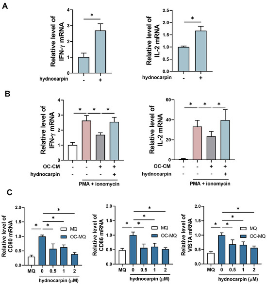 Effect of PF-isolated hydnocarpin on T-cell activation in the tumor microenvironment. RT-PCR was performed to assess the mRNA levels of IFN-γ and IL-2. (A) CCRF-HSB2 cells were treated with 2 μM of hydnocarpin for 48 h. (B) CCRF-HSB2 cells activated by PMA and ionomycin were stimulated with the CM of A2780 (OC-TCs) and 2 μM of hydnocarpin for 48 h. (C) RT-PCR was conducted to evaluate the mRNA levels of immune suppression-related genes (CD80, CD86, and VISTA) in OC-MQs. Dark-blue bars indicate OC-MQs and white bars indicate MQs. Data are representative of three independent experiments. * p < 0.05 compared with the indicated group.
