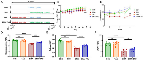 Taurine (500 mg/kg, T0625, Sigma) was administered intragastrically once daily to the TAU and DMA + TAU groups throughout the experimental period. The selected dosage was based on prior studies that demonstrated its efficacy in preserving skeletal muscle integrity under pathological conditions [34]. Body weight and grip strength were recorded at regular intervals.