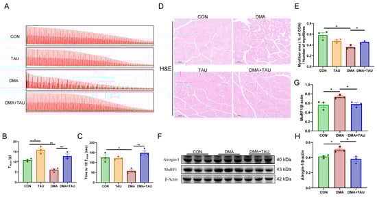 MuRF1 and atrogin-1, two muscle-specific E3 ubiquitin ligases, are key markers of muscle atrophy that are upregulated under atrophic conditions [36]. Both were significantly elevated in the gastrocnemius of DMA mice, while taurine supplementation effectively suppressed their expression (Figure 2F–H).