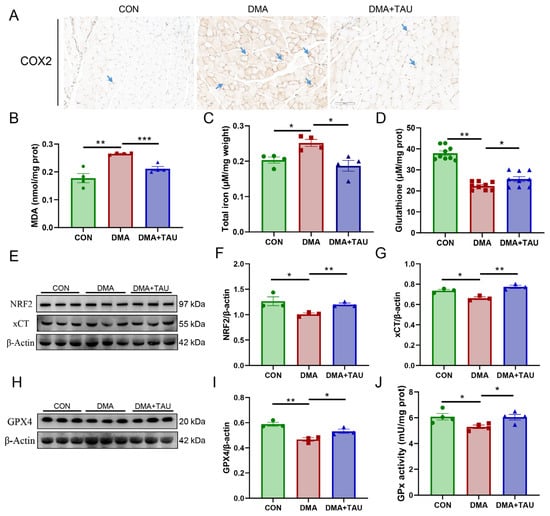 To evaluate the potential involvement of ferroptosis in DMA, we first examined the expression of cyclooxygenase 2 (COX2), the catalyst of the peroxidation and a marker gene of ferroptosis [37]. Immunohistochemical staining showed significant upregulation of COX2 in DMA mice (Figure 3A), which was significantly reduced by taurine treatment.