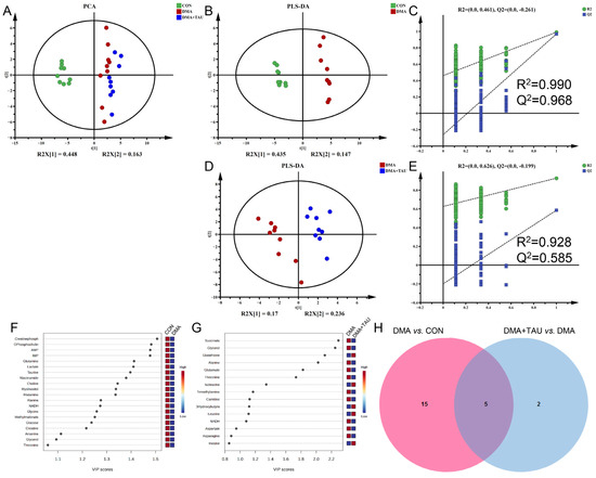 Taurine modulates metabolic disturbances in the gastrocnemius muscle of DMA mice. (A) PCA score plot showing distinct metabolic profiles among the three groups (CON, DMA, and DMA + TAU) (biological replicates, n = 9). (B,D) PLS-DA score plots for group comparisons (biological replicates, n = 9): (B) DMA vs. CON, (D) DMA + TAU vs. DMA, showing sharp, distinct metabolic profiles between groups. (C,E) Validation of the PLS-DA models for DMA vs. CON (C) and DMA + TAU vs. DMA (E) using 200 permutation tests, demonstrating the robustness and predictive ability of the models. (F,G) VIP score ranking of metabolites with VIP > 1 from PLS-DA models for the DMA vs. CON (F) and DMA + TAU vs. DMA (G) comparisons, highlighting significant metabolic changes. (H) Venn diagram illustrating the overlap of characteristic metabolites identified from the PLS-DA models of DMA vs. CON and DMA + TAU vs. DMA.