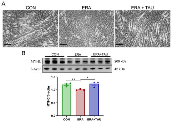 Taurine restores myogenic differentiation potential in ERA-impaired C2C12 myotubes. (A) Representative morphological images of myotubes treated with erastin (ERA, 2 μM) alone or in combination with taurine (TAU, 5 mM), showing the protective effect of taurine on myogenic differentiation. Scale bar: 200 μm. Total magnification: 100×. (B) Western blot analysis and gray value analysis of MYHC expression showing that taurine significantly restores myogenic differentiation potential (biological replicates, n = 3). Data are presented as mean ± SEM and analyzed using one-way ANOVA with Tukey’s post hoc test. Statistical significance: * p < 0.05, ** p < 0.01 vs. DMA.