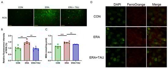 Taurine attenuates ERA-induced oxidative stress in C2C12 myotubes. (A,B) Fluorescence microscopy images (A) and quantification (B) of ROS levels in myotubes treated with ERA (2 μM) alone or in combination with TAU (5 mM), (Biological replicates, n = 5), demonstrating the ability of taurine to reduce oxidative stress. Scale bar: 200 μm. Total magnification: 100×. (C) Quantification of MDA levels in myotubes in different treatment groups, indicating the role of taurine in attenuating lipid peroxidation. (Biological replicates, n = 5). (D) Confocal fluorescence microscopy images of Fe2+ staining illustrating iron accumulation in ERA-treated myotubes and its reduction by taurine. Scale bar: 10 μm. Total magnification: 630×. Data are presented as mean ± SEM and analyzed by using one-way ANOVA with Tukey’s post hoc test. Statistical significance: ** p < 0.01, *** p < 0.001 vs. DMA.