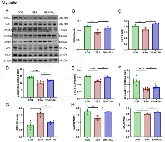 Differentiated myotubes were assigned to three experimental groups: control (CON)—untreated myotubes; erastin-treated (ERA)—myotubes treated with 2 μM erastin; erastin + taurine (ERA + TAU)—myotubes treated with 2 μM erastin and 5 mM taurine.