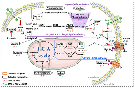 The following supporting information can be downloaded at: https://www.mdpi.com/article/10.3390/antiox14070847/s1, Figure S1: Representative 1D 1H-NMR spectra of aqueous metabolites extracted from mouse gastrocnemius muscle; Figure S2: 2D 1H-13C HSQC spectra of aqueous metabolites extracted from mouse gastrocnemius muscle; Figure S3: Metabolic pathway analysis of DMA vs. CON and DMA + TAU vs. DMA comparisons; Table S1: NMR resonance assignments of aqueous metabolites extracted from mouse gastrocnemius muscle; Table S2: One-way ANOVA analysis of aqueous metabolites in gastrocnemius muscle across experimental groups; Table S3: Common characteristic metabolites identified from pairwise comparisons of DMA vs. CON and DMA + TAU vs. DMA. Table S4: Significantly altered metabolic pathways identified in the pairwise comparisons of DMA vs. CON and DMA + TAU vs. DMA. Table S5. Significantly altered metabolites across the comparisons. Table S6. Key biomarkers and their roles in ferroptosis.