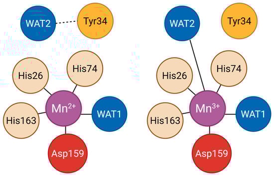At the catalytic core, the manganese ion is ligated by inner sphere residues His26, His74, His163, and aspartic acid (Asp)159, along with a coordinating solvent molecule (referred to as WAT1, the first-shell water ligand bound to the manganese ion) that may exist as water or hydroxide [23]. The coordination geometry of the Mn2+ and Mn3+ active sites is illustrated in Figure 2. This configuration is essential for SOD [25]. Supporting this core, outer sphere residues including His30, tyrosine (Tyr)34, phenylalanine (Phe)77, tryptophan (Trp)78, Trp123, glutamine (Gln)143, Trp161, and Glu162 form a hydrogen bond network that facilitates proton transfer and stabilizes the catalytic transition states [22,23].