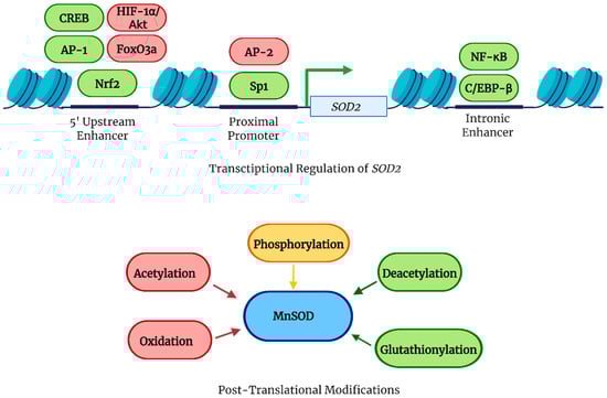 Transcriptional regulation and post-translational modifications can modulate the activity and stability of the enzyme. Three main regions of SOD2 are involved in regulating MnSOD expression: the 5′ upstream enhancer, the proximal promoter, and the intronic enhancer [31]. The 5′ upstream enhancer region contains binding sites for many transcription factors, namely activator protein-1 (AP-1), cAMP response element-binding protein (CREB), nuclear factor erythroid 2-related factor 2 (Nrf2), forkhead box O3a (FoxO3a), nuclear factor kappa-light-chain-enhancer of activated B cells (NF-κB), and hypoxia-inducible factor 1-alpha (HIF-1α) [16]. Nrf2 binds to the antioxidant response element in the promoter region of antioxidant genes, consequently increasing MnSOD expression; similarly, PGC-1α promotes the expression of antioxidative enzymes, including MnSOD [16]. Additionally, PGC-1α induces Nrf2-mediated MnSOD expression in the liver during Staphylococcus aureus-induced peritonitis [32]. HIF-1α and protein kinase B (Akt)-induced phosphorylation of forkhead box O3a (FoxO3a) downregulates MnSOD transcription, whereas sirtuin 3 (SIRT3), a mitochondrial nicotinamide adenine dinucleotide (NAD+)-dependent deacetylase, deacetylates FoxO3a and has the opposite effect [16]. The proximal promoter of MnSOD has CG repeats with binding sites for specificity protein 1 (Sp1), a transcriptional activator that promotes MnSOD expression. Activating protein-2 (AP-2), a transcription factor, also binds to the proximal promoter and competes with Sp1 for binding to the same promoter regions. When AP-2 binds, it can either directly inhibit Sp1 by occupying these sites or form AP-2/Sp1 complexes. The formation of AP-2/Sp1 complexes sequesters Sp1 away from the promoter, preventing it from activating MnSOD transcription effectively, thus reducing MnSOD expression [31]. Lastly, the intronic enhancer, located within the second intron, enhances Sp1 activity in the proximal promoter and possesses a nuclear factor kappa-light-chain-enhancer of activated B cells (NF-κB) binding site that interacts with CCAAT/enhancer-binding protein beta (C/EBP-β) to promote MnSOD transcription. Additionally, MnSOD is susceptible to inactivation by peroxynitrite (ONOO−), which nitrates critical tyrosine residues [16,31,33,34]. These regulatory mechanisms are summarized in Figure 3.