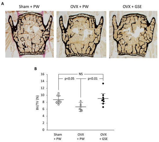 Effect of oral administration of proanthocyanidin-rich grape seed extract (GSE) on bone loss in the third and fourth lumbar vertebrae from spines of ovariectomized (OVX) mice. (A) Representative images of von Kossa-stained third vertebrae from each of the three groups. (B) The trabecular bone volume/total volume (BV/TV) ratio was determined by histological analysis of bones in the lumbar spine. In (B), the results are expressed as mean ± standard deviation, showing individual data (n = 9 in Sham + PW, n = 8 in OVX + PW and OVX + GSE). PW: pure water, NS: not significant (p > 0.05). Adapted from Tenkumo et al. [75], Scientific Reports, (2020), doi.org/10.1038/s41598-020-65403-4, used under CC BY 4.0.