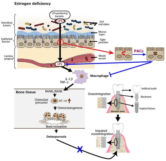 Postmenopausal osteoporosis as a putative risk factor for impaired osseointegration leads to lower success rates of dental implants. Estrogen deficiency reduces intestinal barrier function, leading to lipopolysaccharides (LPS) in the blood. LPS activates macrophages to secrete inflammatory cytokines such as interleukin (IL)-1β and tumor necrosis factor (TNF)-α, which interact with receptor activator of nuclear factor kappa beta (NF-κB) ligand (RANKL)/RANK, triggering NF-κB activation and osteoclastogenesis. The resultant osteoporosis could impair osseointegration of the alveolar bone and dental implants. Blue lines indicate inhibitory sites.