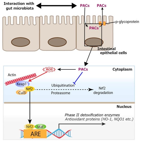 Cellular uptake of proanthocyanidins (PACs) and activation of nuclear factor erythroid 2-related factor 2 (Nrf2) by reactive oxygen species (ROS) produced from PACs. A limited amount of oligomeric PACs (degree of polymerization 2 to 6) could be trans-cellularly incorporated, which would subsequently be excreted via an efflux pump, p-glycoprotein. PACs prevents the ubiquitin-mediated degradation of Nrf2, and ROS generated through the oxidation of PACs activate Nrf2, thereby promoting the transcription of antioxidant enzymes such as heme oxygenase-1 (HO-1) and NAD(P)H quinone dehydrogenase 1 (NQO1). Keap1: Kelch-like ECH-associated protein 1, Cul3: cullin 3, Maf: small Maf proteins, ARE: antioxidant response element. A blue line indicates an inhibitory site, and a red line indicates a site of action.