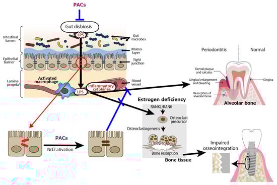 In terms of periodontal disease from the gut bacteria perspective, it has been reported that DSS-induced enteritis in mice, a common model of human inflammatory bowel disease that exhibits macrophage activation in the colon, impaired intestinal barrier function, and increased Gram-negative bacteria [53,54], with increased alveolar bone resorption over time [55]. Macrophage activation, reduced intestinal barrier function, and increased Gram-negative bacteria indicate that LPS leaks into the blood from the site of tight junction disruption, and inflammatory cytokines are produced by activated macrophages, which may also affect periodontal tissue. PACs are expected to prevent the exacerbation of periodontal diseases by improving gut barrier function (Figure 2).