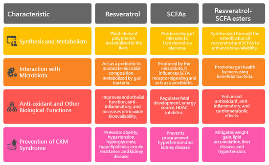 Trillions of microbes reside in the human gut, collectively forming the gut microbiota—a complex ecosystem that has coevolved with humans in a mutually beneficial relationship. Disruptions to this microbial balance, known as dysbiosis, have been increasingly linked to various CKM conditions, including obesity, type 2 diabetes, metabolic syndrome, CKD, hypertension, and CVD [7,8,9,10]. Emerging evidence suggests that adverse maternal environments and early-life exposures have a critical role in shaping the development of the offspring’s gut microbiome, with long-term implications for adult CKM health [11]. On the other hand, approaches aimed at modulating the gut microbiota—through the use of probiotics, prebiotics, and postbiotics—have demonstrated potential in enhancing metabolic programming and improving CKM-related outcomes in offspring [12,13]. Among these, resveratrol and short-chain fatty acids (SCFAs) stand out for their ability to modulate gut microbiota composition and function through prebiotic-like and postbiotic mechanisms, respectively.