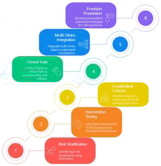 To bridge the translational gap, future research must conduct rigorous clinical trials to evaluate the safety and efficacy of resveratrol, SCFAs, and related interventions during pregnancy and lactation. These trials should focus on intervention timing, targeting critical developmental windows with well-characterized protocols. Integrating multi-omics approaches—including metabolomics, microbiome, and epigenetic profiling—will be essential for uncovering causal mechanisms and identifying predictive biomarkers. Furthermore, although many natural and synthetic resveratrol derivatives have demonstrated bioactivity in vitro and in animal studies [130], only a limited subset has been evaluated in the context of developmental reprogramming for CKM syndrome. Advancing these candidates into precision prevention strategies, especially in high-risk mother-infant cohorts, is crucial for transforming preclinical evidence into effective human therapies.