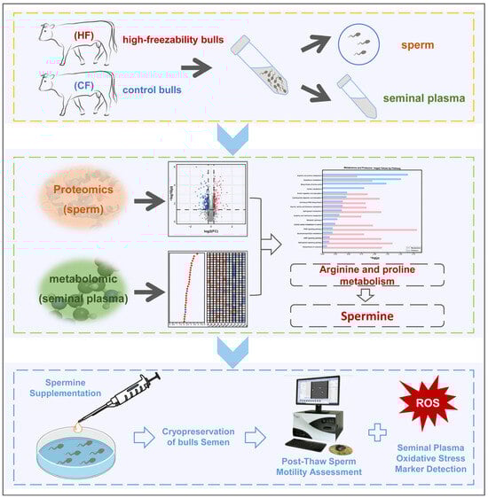 We integrated proteomic and metabolomic datasets from high-freezability (HF) and control (CF) bulls, screened coordinated pathways (including arginine and proline metabolism), and functionally validated spermine’s cryoprotective effects via exogenous supplementation (Figure 1). This study elucidates the molecular basis of the sperm–seminal plasma synergy in cryotolerance, providing a foundation for the optimization of bull selection and cryoprotectant design.