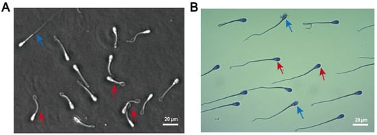 Morphological assessment of spermatozoa. (A) Plasma membrane integrity evaluated by HOST. Red arrows indicate spermatozoa with intact plasma membranes; blue arrows denote dead spermatozoa. (B) Acrosomal integrity assessed by Coomassie Brilliant Blue staining. Red arrows indicate intact acrosomes; blue arrows highlight damaged acrosomes.