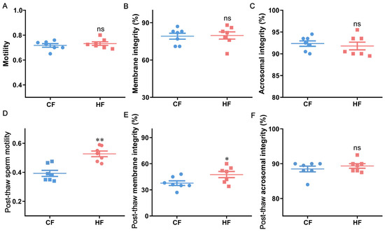 Sperm quality parameters in HF and CF bulls. Fresh sperm (A) motility, (B) membrane integrity, and (C) acrosome integrity; post-thaw sperm (D) motility, (E) membrane integrity, and (F) acrosome integrity. Data are presented as mean ± SEM (n = 7). Individual points represent HF and CF samples. ** p < 0.01, * p < 0.05, ns (not significant, p > 0.05).