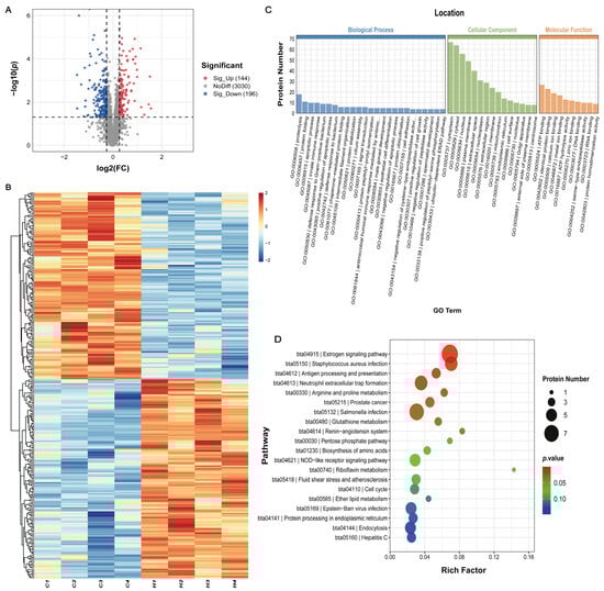 Identification and functional enrichment analysis of DEPs between HF and CF bulls. (A) Volcano plot of DEPs. The blue dots represent downregulated DEPs, red dots represent upregulated DEPs, and gray dots represent non-significant proteins. (B) Hierarchical clustering heatmap of DEPs. Red and blue indicate high and low expression levels, respectively. (C) Gene Ontology (GO) annotation of DEPs, classified into cellular components, biological processes, and molecular functions. The bar graph illustrates the distribution of DEP numbers across enriched terms in each category. For clarity, we present the top 25 biological processes, top 15 cellular components, and top 10 molecular functions, ranked by the number of annotated DEPs. (D) KEGG pathway enrichment analysis of DEPs. Bubble color indicates p-value significance, while size reflects gene count.